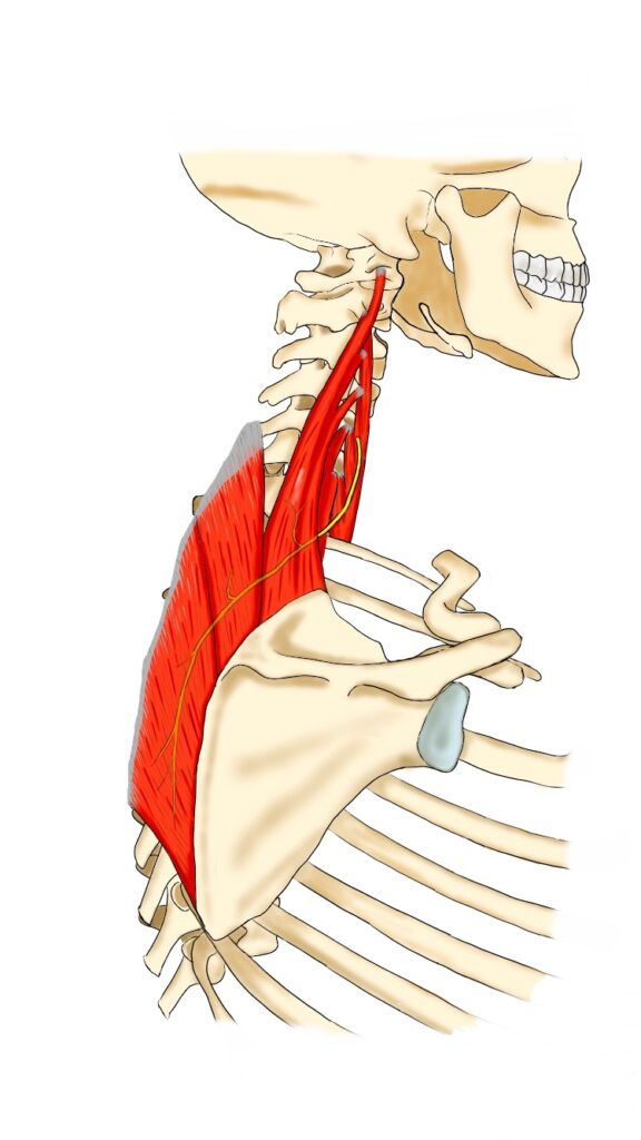 首・肩から腕にかけての症状の多くは、首の骨の周囲や肩甲骨まわりにある深い筋肉(斜角筋や肩甲挙筋など)がガチガチにこわばり、その近くや間を通る神経・血管を強く圧迫していることによって起こります。