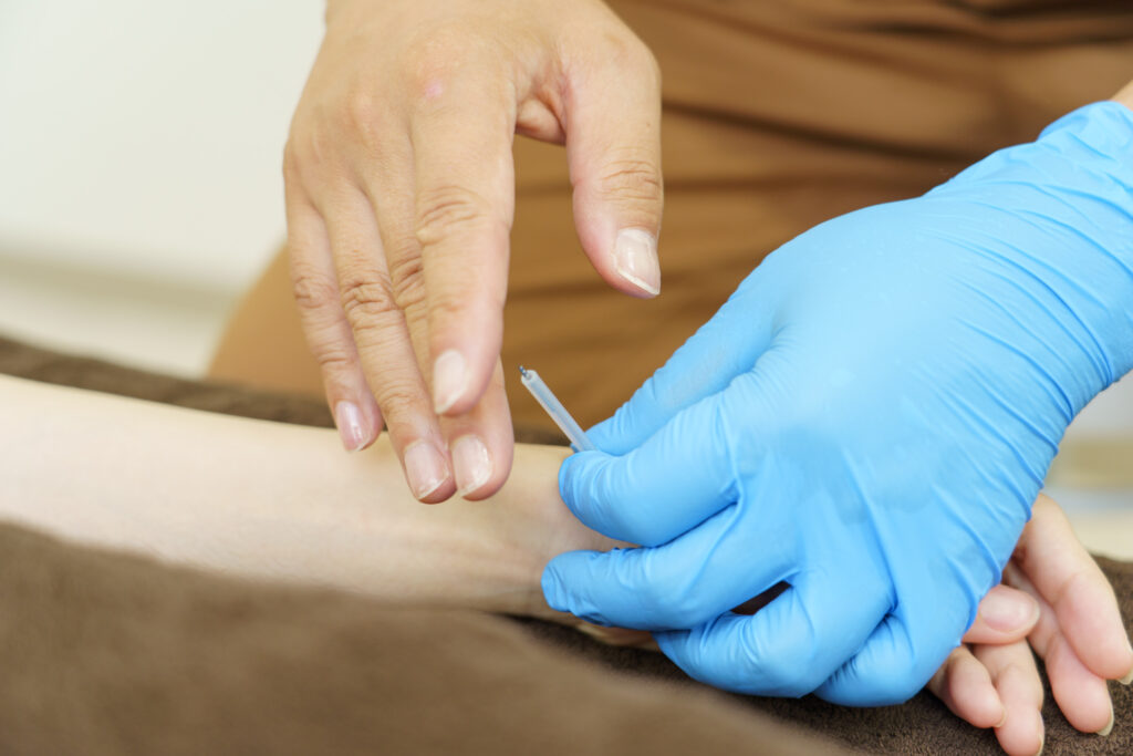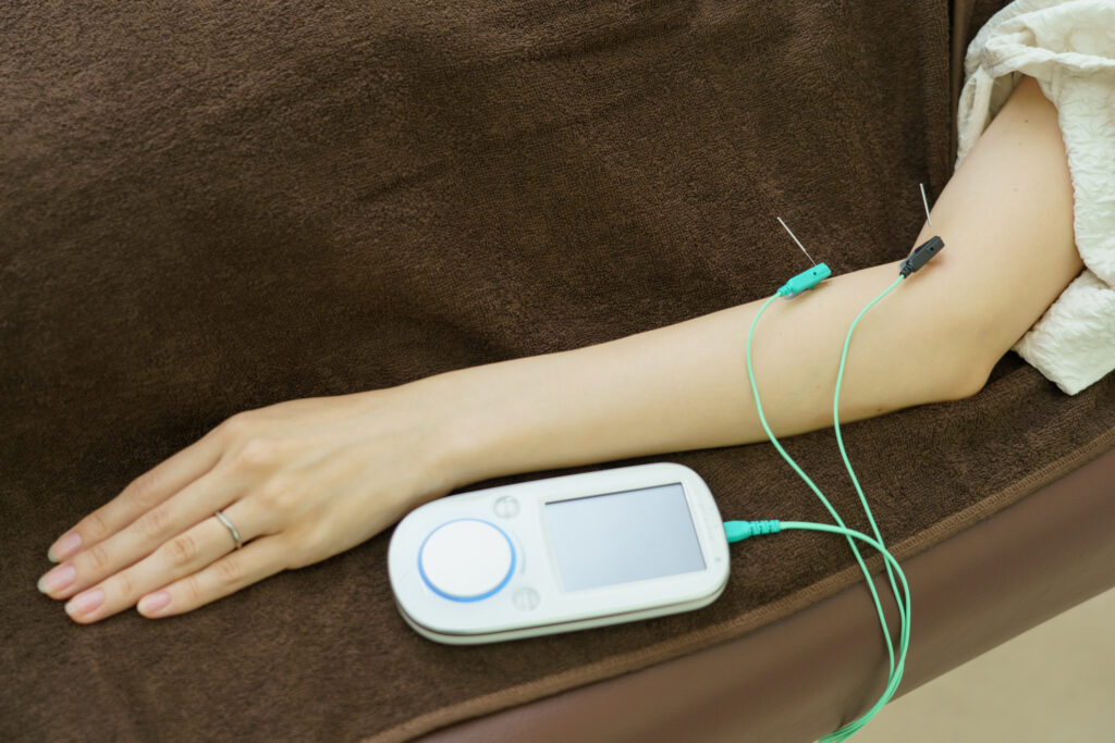 細く正確な鍼が、手では届きにくい首の付け根や肩甲骨まわり、腕へとつながる深層筋の緊張部位にピンポイントで到達します。