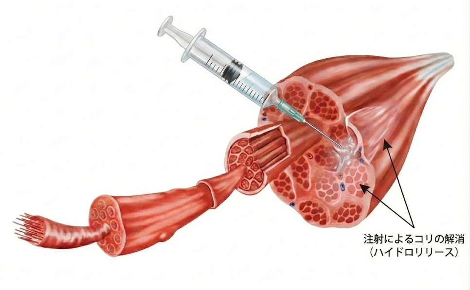 ハイドロ筋膜リリースは、凝り固まった筋肉・筋膜に注射することで、コリを物理的にほぐす治療方法です。