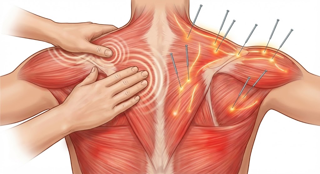 ハイドロ筋膜リリースは局所を強力に施術できる一方で、注射部位以外の効果は限定的です。そこに加え、たくさんの箇所にアプローチできる鍼灸やマッサージ(徒手)を併用すると、より効果的です。