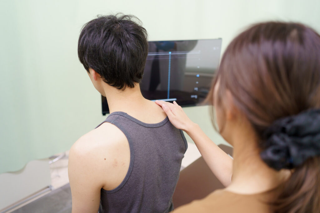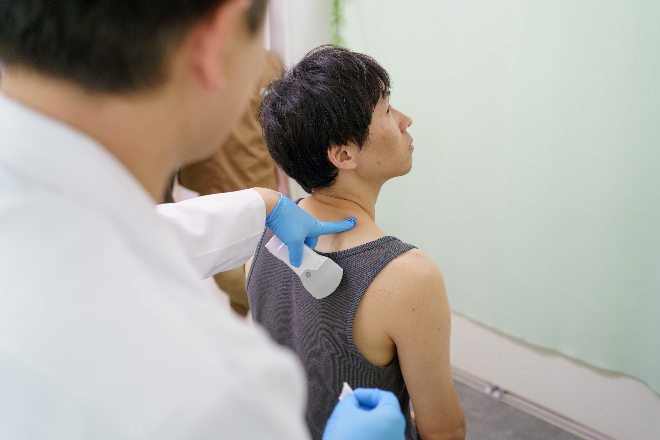 まずは大元となっている筋膜の癒着や筋硬結(コリ)部位を同定します。同時に、超音波(エコー)にて痛みの評価を行います。