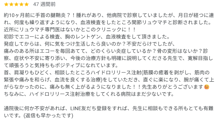 近所にリュウマチ専門医はないかとこのクリニックに!! 初診でエコーによる検査、胸のレントゲン、血液検査をして頂きました。 発症してからは、何に気をつけ生活したら良いのか?不安だらけでしたが、 痛みのある所はエコーを毎回あてて、どのくらい炎症しているか?骨の変形はないか?